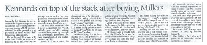 In 2004, Kennards Self Storage teamed up with Valad Property Group to successfully acquire 24 self storage properties operating under the Millers Self Storage brand. Valad is a Real Estate Investment Trust (R.E.I.T.) listed on the Australian Stock Exchange, with investments in office, industrial, bulky goods retail as well as self storage.